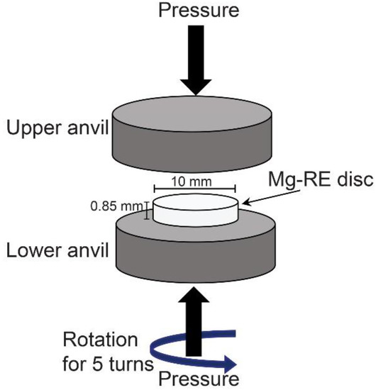 As noted earlier, the initial microstructures of these three Mg–RE alloys were characterised by typical as-cast microstructures mostly in the form of coarse grains with the presence of second phases Mg12Nd, Mg24Nd, and Mg41Nd5 in Mg-1.4Nd alloy, Mg12Gd in Mg-0.6Gd alloy, and Mg24Dy5 in Mg-0.4Dy alloy [13,58]. The Mg–RE discs with 10 mm diameters and 0.85 mm thicknesses were processed by HPT at RT through 5 turns as illustrated in Figure 1 with a 1 rpm rotational speed using an imposed applied pressure of 6.0 GPa under quasi-constrained conditions [66]. Thereafter, the HPT-processed samples were annealed in a radiation furnace for 1 h at 250 or 450 °C.