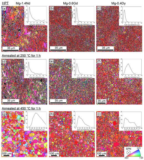 SPN-IPF maps and grain size distributions of HPT-processed: (a) Mg-1.4Nd, (b) Mg-0.6Gd, (c) Mg-0.4Dy, annealed at 250 °C for 1 h: (d) Mg-1.4Nd, (e) Mg-0.6Gd, (f) Mg-0.4Dy and annealed at 450 °C for 1 h: (g) Mg-1.4Nd, (h) Mg-0.6Gd, and (i) Mg-0.4Dy alloys. The HAGBs are indicated by a black line. SPN denotes the shear plane normal direction.