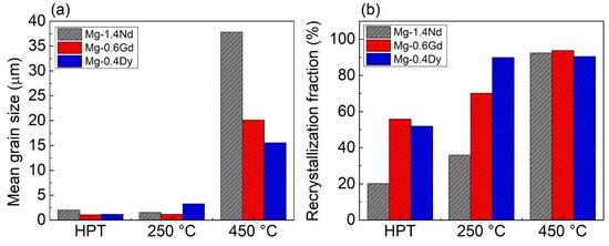 Evolution of: (a) mean grain size and (b) recrystallisation fraction of HPT-processed and annealed Mg-1.4Nd, Mg-0.6Gd, and Mg-0.4Dy alloys at 250 and 450 °C for 1 h, respectively.