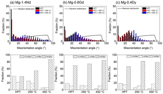 Grain boundary misorientation angle distributions and fractions of VLAGBs, LAGBs, and HAGBs of samples HPT-processed and annealed at 250 and 450 °C for 1 h: (a) Mg-1.4Nd, (b) Mg-0.6Gd, and (c) Mg-0.4Dy alloys.
