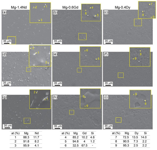 The EDS analysis of HPT-processed Mg-0.6Gd sample shows also the presence of three types of particles: the atomic percentage of Mg and Gd of the point 4 allows the identification of the particle as the Mg5Gd phase [72]. By contrast, points 5 and 6 indicate the presence of particles with low (4.0%) and high atomic fractions (67.5%) of Gd, respectively. The EDS analysis of the HPT-processed Mg-0.4Dy sample shows the presence of Mg24Dy5 second phase (point 7) and particles with a low fraction of Dy (points 8 and 9). The development of particles without knowing their stochiometry (points 5 and 6) in the Mg-0.6Gd alloy and points (8 and 9) in the Mg-0.4Dy alloy are probably due to the fragmentation during HPT processing of the initial Mg5Gd and Mg24Dy5 second phases [13], respectively. The presence of Si element in different points in Mg-0.6Gd and Mg-0.4Dy alloys is due to grinding with SiC papers during the sample preparation. It is apparent from Figure 5 that the amount of the second phases in Mg-1.4Nd samples is much higher than in the Mg-0.6Gd and Mg-0.4Dy samples and their distributions change after annealing treatments as is evident by the magnification of the yellow boxes of the annealed Mg-1.4Nd samples (Figure 5d,g) because of the development of precipitation phenomena [59,73]. It is well known that precipitation occurs in the supersaturated solid solution (SSS) Mg–Nd alloy during the annealing temperature range of 150–450 °C and can follow the sequence [73]:
