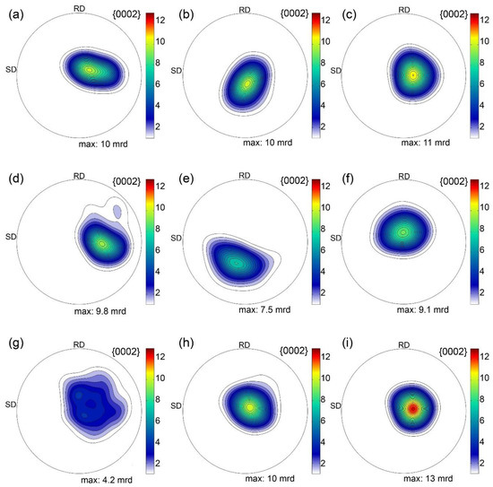 Evolution of texture presented by the recalculated {0002} pole figures of the HPT-processed: (a) Mg-1.4Nd, (b) Mg-0.6Gd, (c) Mg-0.4Dy, annealed at 250 °C for 1 h: (d) Mg-1.4Nd, (e) Mg-0.6Gd, (f) Mg-0.4Dy and annealed at 450 °C for 1 h: (g) Mg-1.4Nd, (h) Mg-0.6Gd, and (i) Mg-0.4Dy alloys.