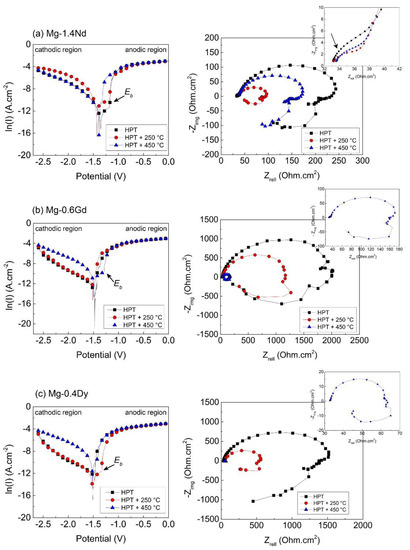 As is noted, the corrosion resistance of the HPT-processed Mg-0.6Gd and Mg-0.4Dy samples significantly decreases with increasing annealing temperature whereas the corrosion resistance of the HPT-processed Mg-1.4Nd sample decreases after annealing at 250 °C and becomes better after annealing at 450 °C. These tendencies are in good agreement with the evolution of potentiodynamic polarisation curves.