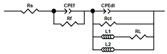 In these equivalent circuits, Rs, Rct, Rf, and RL present the solution resistance, charge transfer resistance, film resistance, and inductance resistance, respectively, and CPEdl and CPEf are constant phase elements representing the capacitive loops in the high and medium frequencies regions, respectively. The CPE is defined by two values, Y and n, and it is used instead of the capacitor in the case of a non-homogeneity of the sample surface [80]. When n = 1, CPE is equal to a capacitor.