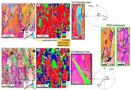 IPF and GOS maps of selected regions from the microstructures of: (a,b) HPT-processed (from Figure 2) and (c,d) annealed Mg-1.4Nd at 250 °C for 1 h (from Figure 2) showing the presence of (e,f) an extension twin (black box) and corresponding {0002} pole figure and (g,h) a sub-grain development mechanism (green box).