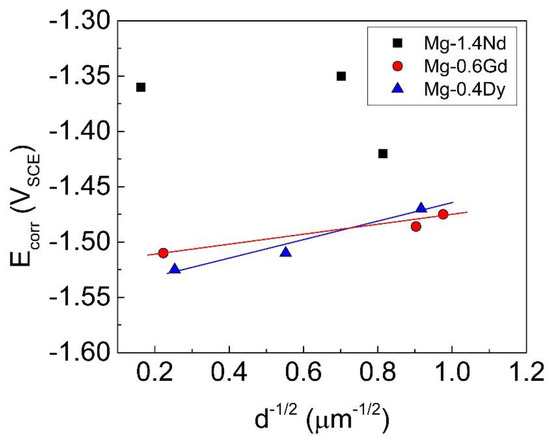 To analyze the effect of grain size on the corrosion resistance of these Mg–RE alloys, the Ecorr was connected with the mean grain size, d, based on a Hall–Petch type relationship as follows [91,92]: