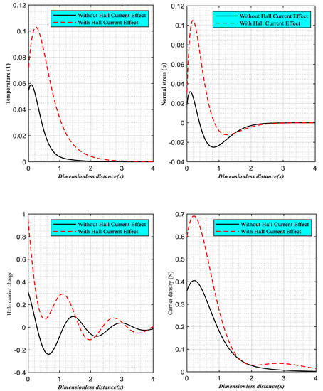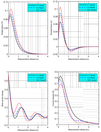 The first group of images in Figure 3 illustrates the instantaneous axial distributions of the primary real dimensional fields (small time ). It is possible to create models of photo-thermoelasticity exposed to a strong magnetic field and the Hall current effect by comparing how much thermal relaxation times vary when the influence of laser pulses is incorporated. The thermal wave under the impact of the laser heat flux condition applied at the outer surface of the silicon medium is shown in the first inset for examination of the dimensionless temperature distributions. The effects of optical-thermal excitation, laser pulses, and magnetic field pressure are depicted in the first subfigure, showing that the dimensionless thermal wave values begin as positive, increase to a maximum value near the medium’s edge, and then decrease as distance increases until they approach the zero line, satisfying the stability state. In contrast, the growth of the thermal wave was exponential. The second panel shows the distribution of normal stress (mechanical waves) throughout the axial distance. The mechanical wave distributions exhibit the requisite abrupt increase from a positive value at the edge to a peak-maximum value towards the surface that is characteristic of mechanical ramps (due to the pressure force of a strong magnetic field or Hall current and laser pulse effect). The mechanical wave weakens as it moves away from the surface, and this weakening continues until the wave approaches the zero line, where it seeks equilibrium. The third inset depicts the impact of thermal and elastic relaxation time on the dimensional hole carrier charge distribution throughout the axial distance (thermal memory). The hole carrier charge distributions start with positive maximum values at the boundary edge and quickly decline to the lowest peak after recombination with the plasma. However, in the second region, the hole carrier charge distributions once again grow, stabilize locally within the material for a brief period of time, and then fall to the stable state through convergence to the zero line. Plasma recombination processes cause the carrier density, which represents plasma waves (the dispersion of the electron charge field), to start off with a positive value at the edge, as seen in the fourth inset. Plasma waves, driven by optical-thermal energy and a Hall current, peak abruptly at the surface, then retreat gradually according to an exponential decay curve as they travel into the semiconductor medium. When the plasma waves approach the zero line, stability is achieved. According to experimental observations, the distribution decreases exponentially with distance from the surface until it reaches equilibrium at the zero line inside the semiconductor medium [41,42].