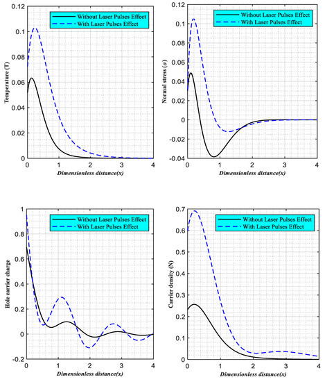 The third group shows the effect of a laser pulse, plotting the major field distributions versus the laser’s power intensity (Figure 5). This study looks at two scenarios by applying the DPL model to Hall’s current effects on silicon semiconductor materials over short periods. The presence of laser intensity is shown in the first subfigure, which depicts the distribution of basic fields. In the second subfigure, physical fields are shown to be distributed when no laser pulses are present. Optical stimulation, laser pulses, and the compressive intensity of a strong magnetic field in conjunction with the Hall current cause internal particles in the semiconductor medium to smash violently, resulting in a cloud of surface electrons (plasma). In this situation, all physical values propagate differently as waves compared to when there is no laser impact. Yet, in the presence of laser pulses, the semiconductor lattice undergoes a reorganization of its interior particles (through spindle movement of particles). By increasing the number of holes and free electrons on the semiconductor’s surface, the laser pulse increases the flow of electric current within the semiconductor.