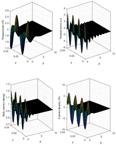 Temperature, strain, carrier density, hole carrier charge field, and stress may all be computed and graphically represented in 1D in the time domain using the Riemann sum approximation and numerical inversion of the Laplace transform. Silicon (Si) is a semiconductor material that might be used in this hypothetical situation. Here, Table 1 displays the input parameters (in SI units) used for the Si material and the magnetic field parameters (from [37,38,39]):