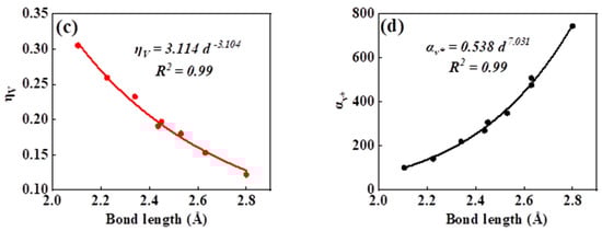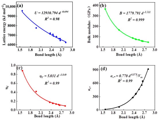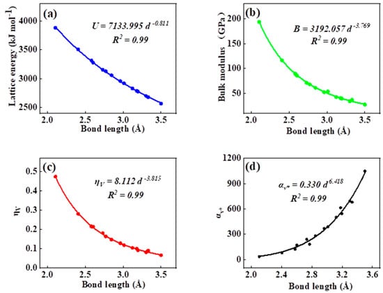 As can be seen in all investigated systems of Table 1, Table 2, Table 3 and Table 4, we can find a general trend in the lattice energy, bulk modulus, chemical hardness, and electronic polarizability with chemical bond length. Therefore, to search for a detailed and precise relation between these physicochemical parameters and the chemical bond length of binary ANB8-N crystals, we plotted the data of the lattice energy, bulk modulus, chemical hardness, and electronic polarizability in Table 1, Table 2, Table 3 and Table 4 as a function of chemical bond length in Figure 1, Figure 2, Figure 3 and Figure 4. Furthermore, for the estimation of chemical hardness and polarizability, we introduced a parameter of molar volume of inorganic materials that can be easily obtained by means of their chemical formulas and densities in their curve fitting assessment. According to pioneering studies on the concept of lattice energy density by Zhang’s group, we defined ηV (ηV = η/Vm) as chemical hardness density []. Meanwhile, αv* (αv* = α·Vm) is defined as a product of electronic polarizability and molar volume learned from Qi’s ideas []. As can be seen from Figure 1, Figure 2, Figure 3 and Figure 4, it is worth noting that a very good agreement exists between these physicochemical parameters and the chemical bond length of binary ANB8-N crystals, and the correlation coefficient R2 values are larger than 0.9 (most correlation R2 values are 0.99), indicating that least squares fittings and calculations are effective and reliable for the present binary ANB8-N crystal systems. The corresponding trend lines, correlation equations, and the values of squares of correlation coefficient are given in Figure 1, Figure 2, Figure 3 and Figure 4. The normal mathematical expression between the abovementioned parameters and the chemical bond length is P = a·db (P represents these parameters, d is chemical bond length). The detailed data on constant, a and b, are listed in Figure 1, Figure 2, Figure 3 and Figure 4. As can be seen from Figure 1a–c, Figure 2a–c, Figure 3a–c and Figure 4a–c, there is a clear decreasing trend in the lattice energy, bulk modulus, and chemical hardness along with the chemical bond length. However, different trends can be seen in Figure 1d, Figure 2d, Figure 3d and Figure 4d, where we plotted the data on electronic polarizability as a function of chemical bond length for binary ANB8-N crystals.