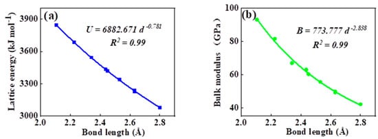 The lattice energy of inorganic crystals plays a significant role in the exploration of the existence and stability of materials based on the analysis of thermodynamics [,,,]. Namely, this energy is considered to be one of most important quantities in the matter of whether new inorganic materials can be synthesized by using designed synthetic routes [,,,]. Hence, the computation and estimation of lattice energy has attracted great attention in the field of modern materials science. Normally, lattice energy of inorganic crystals can be determined by means of the Born–Fajans–Haber (BFH) thermochemical cycle based on the experimental data, such as standard formation enthalpy, bond dissociation energy, sublimation enthalpy, ionization energy, and electron affinity [,,]. Such an experimental method can provide important original data needed for precise establishment of a theoretical fitting model. Recently, different theoretical models have been proposed for the evaluation of the lattice energy of inorganic crystals [,,,,]. By means of the dielectric theory of chemical bond of complex crystals, Zhang’s group presented an empirical method for the estimation of the lattice energy of inorganic ionic crystals []. In their subsequent study, a relationship between the lattice energy and bulk modulus of binary inorganic crystals was obtained through introducing the concept of lattice energy density []. At the same time, the bulk modulus of binary inorganic crystals was calculated by using the empirical fitting equation, which shows that there is an existing close relationship between lattice energy and the bulk modulus.