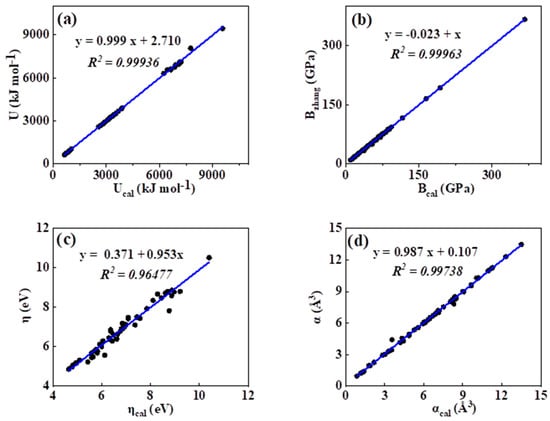 Plot of correlation between the present calculated values and the date reported in the literature. (a) lattice energy, (b) bulk modulus, (c) chemical hardness, (d) electronic polarizability).