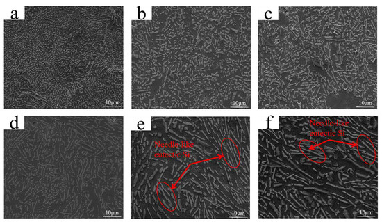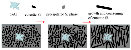 - With an increase in annealing time, growth and coarsening of metastable eutectic Si could be observed. Interestingly, coalescence of rod-like Si could be observed after annealing, forming several long, needle-like Si particles with dozens of microns. In addition, the formation of precipitated Si was detected in α-Al, which grew during the annealing process.