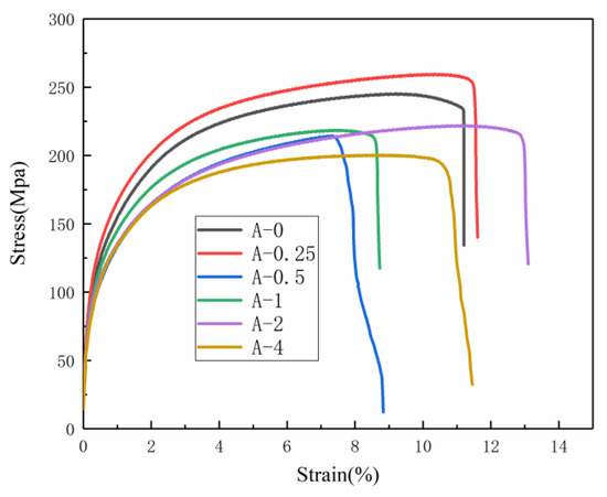 - The yield (~121.5 MPa) and tensile strength (~235.9 MPa) of the A-0.25 sample were ~9.8% and ~5.1% higher than those of the A-0 sample, respectively. Slight increases in the yield strength and tensile strength could be observed in the A-0.25 sample, which can be ascribed to the formation of precipitated Si of limited size during the early stage of annealing. A decrease in tensile stress was observed with further extension of the annealing time.