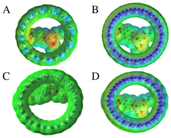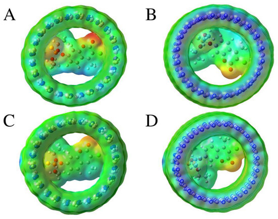 Electrostatic potentials of (A) BNNT(12,12) + par, (B) BNNT(20,0) + par, (C) Al-BNNT(12,12) + par, and (D) Al-BNNT(20,0) + par.