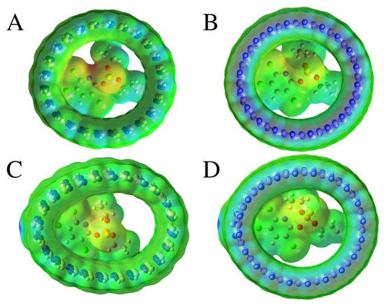Electrostatic potentials of (A) BNNT(12,12) + cou, (B) BNNT(20,0) + cou, (C) Al-BNNT(12,12) + cou, and (D) Al-BNNT(20,0) + cou.