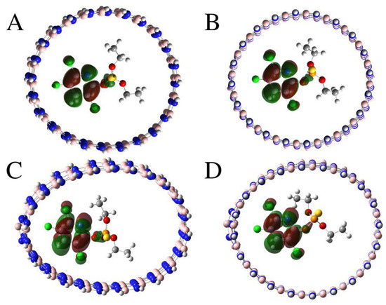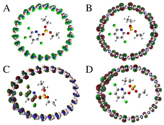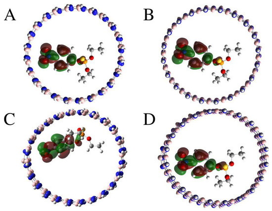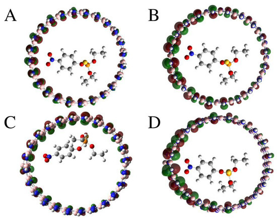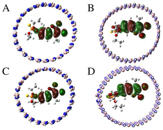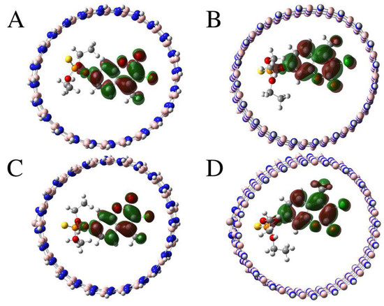 When parathion or chlorpyrifos is encapsulated into BNNTs, the orbital lobes in the HOMO diagram are mainly distributed on the BNNTs (Figure 4 and Figure 5). Due to electronegativity, the orbital lobes are located on the nitrogen atoms and N-B bonds of BNNTs. The HOMO orbital lobes of BNNT(12,12) + chl are light green and uniformly distributed in the BNNT (Figure 5A). In particular, for Al-BNNT(12,12) + chl (Figure 5C), the HOMO is slightly distributed on the orbital lobes of the trichloropyridyl group. This is because when chl is encapsulated by Al-BNNT(12,12), the optimized geometry of BNNT is obviously deformed, allowing the OP to cling to the inner wall of the BNNT.