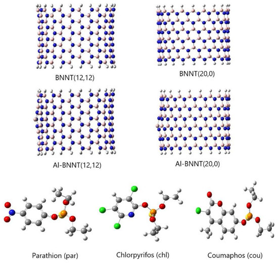 The Nanotube Modeler software (JCrystalSoft, 2018; Version 1.8) from http://www.jcrystal.com/products/wincnt/ (accessed on 23 August 2021) was used to generate the XYZ coordinates of four types of boron nitride nanotube models, namely pristine armchair BNNT(12,12), pristine zigzag BNNT(20,0), Al-doped armchair BNNT(12,12), and Al-doped zigzag BNNT(20,0). Al-doped indicates that the boron site of BNNT is replaced by an Al atom. The four BNNT models with all the edge atoms terminated by monohydrogen were used for the following calculations. The investigated organic pollutants included parathion (par), chlorpyrifos (chl), and coumaphos (cou) (Scheme 1).
