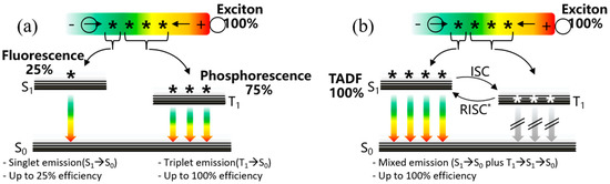 With the increasing demand for organic-light-emitting-diode (OLEDs) displays with low power, deep-blue emitters with a high efficiency have attracted much attention [1,2,3,4,5,6,7,8,9]. The commonly used fluorescent luminescent materials exhibit the characteristics of a long lifetime and low cost. However, 25% of excitons are harvested for luminescence, which causes a lower efficiency when compared to phosphorescent emitters [10,11,12,13,14,15,16]. To improve the efficiency of an OLED, phosphorescence emitters are employed to harvest not only 25% excitons (*) from a singlet and but also 75% excitons (***) from triplet states, as shown in Figure 1a. However, blue phosphorescent emitters suffer from a short lifetime, high cost and severe efficiency roll-off. Then, the TADF materials have been considered as an alternative solution for the blue OLED device because 100% IQE can be achieved by harvesting triplet excitons through the reverse intersystem crossing (RISC) process, as shown in Figure 1b [17,18,19,20,21,22,23].