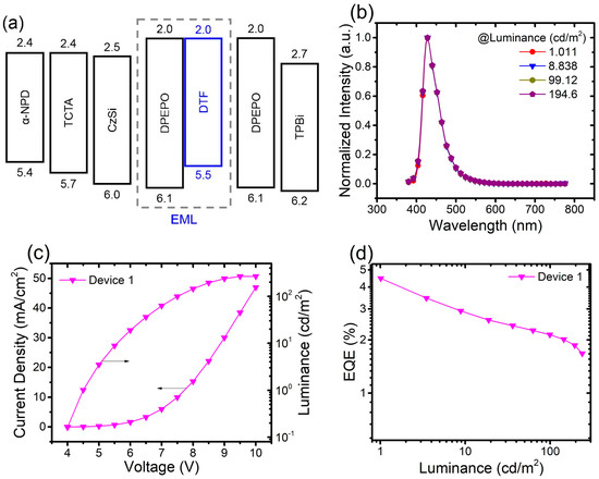 Excitons can be combined well in the DTF films because DPEPO has a high singlet energy level (S1) and triplet energy level (T1). It should be mentioned that the doping concentration of DTF in the emitting layer (EML) is optimized to 16 wt%. Figure 4b shows the electroluminescence (EL) spectra with a different luminance. Device 1 exhibits the same deep-blue emission peaks at 427.0 nm, which is consistent with the PL spectrum. The CIE coordinates of Device 1 are measured to be (0.155, 0.051), demonstrating that the deep-blue OLED device can be fabricated. As shown in the J-V-L plots (Figure 4c), device 1 exhibits a high turn-on voltage (Von = 4.5 V, seen in Table 1), which may be caused by a large injection barrier between DPEPO and TPBi. As depicted in Figure 4d, Device 1 achieves a high EQE (4.5%).