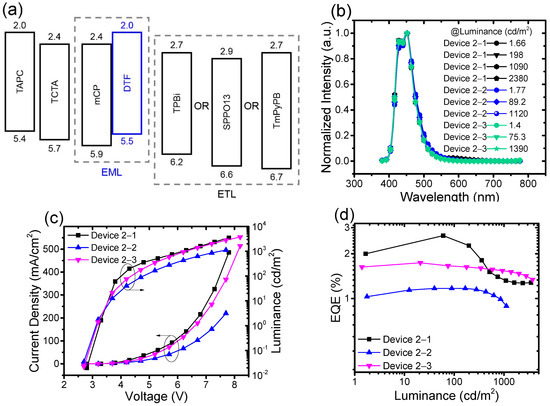 Note that Device 1 exhibits a relatively high Von and low power efficiency (PE = 1.4 lm/W). Therefore, we investigated devices using mCP as the host and TPBi/2,7-bis(diphenylphosphoryl)-9,90-spirobi[fluorene] (SPPO13)/1,3-tri[(3-pyridyl)-phen-3-yl]-benzene (TmPyPB) as the ETL, with the configuration (as shown in Figure 5a) of di-[4-(N,Ndi-tolyl-amino)-phenyl]cyclohexane (TAPC) (40 nm)/TCTA (10 nm)/1,3-bis(carbazole-9-yl)benzene (mCP):24 wt% DTF (20 nm)/ETL (45 nm)/LiF (0.8 nm). The doping concentration of DTF is optimized to 24 wt%. The materials of the ETL layers are TPBi, SPPO13, and TmPyPB for Devices 2-1, 2-2, and 2-3, respectively. Figure 5b shows the EL spectra of Devices 2-1, 2-2, and 2-3 at different luminances. In the normalized EL spectra of Device 1, the intensity of the peak at 427 nm is higher than the peak at 450 nm. However, in Devices 2-1, 2-2 and 2-3, the intensity of the peak at 450 nm is higher than the peak at 427 nm. Therefore, there is a slight red shift of Devices 2-1, 2-2 and 2-3 compared to Device 1. The red shift may be caused by poor exciton confinement in the EML and can be estimated by the CIE coordinate variation [43]. The CIE coordinates of Devices 2-1, 2-2 and 2-3 are measured to be (0.160, 0.064), (0.151, 0.062) and (0.151, 0.056). The emissions of Devices 2-1, 2-2, 2-3 are slightly red-shifted compared with Device 1. The J-V-L plots are shown in Figure 5c. Devices 2-1, 2-2, and 2-3 exhibit a lower Von of 3.2 V, 3.1 V and 3.1 V (shown in Table 1). The lower Von may be caused by a lowered injection barrier. Moreover, as shown in Figure 5d, Devices 2-1, 2-2 and 2-3 exhibit a lower external EQE of 2.7%, 1.2% and 1.7%, respectively.