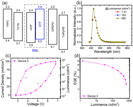 In contrast to the Device 1, Devices 2-1, 2-2, and 2-3 exhibit a lower Von and lower EQE, which may be caused by hole leakage from EML to ETL. DPEPO with a larger steric hindrance, higher energy gap and higher excited state energy levels possess a better capacity for hole blocking and exciton confinement in the deep-blue device. Therefore, we use DPEPO as a hole-blocking layer and investigate Device 3 with the configuration shown in Figure 6a: TAPC (40 nm)/TCTA (10 nm)/mCP:24 wt% DTF (20 nm)/DPEPO (5 nm)/TmPyPB (45 nm)/LiF (0.8 nm). The thickness of DPEPO is optimized to 5 nm. The EL spectra of Device 3 are depicted in Figure 6b, indicating stable deep-blue emission peaks at 427.0 nm in this device with the CIE coordinates of (0.155, 0.055). The J-V-L plots are shown in Figure 6c. Device 3 exhibits a Von of 3.3 V (shown in Table 1). Most importantly, Device 3 exhibits a high EQE of 5.0% in Figure 6d. It is challenging for the CIE y of TADF blue emitters to reach a deeper region (CIE y < 0.06) [44]. Normally, most reported OLEDs with CIE y < 0.06 were achieved by traditional fluorescent deep-blue emitters. Here, deep-blue fluorescent OLEDs with a high EQE of 5.0% (reaching the theoretical limit) were reported.