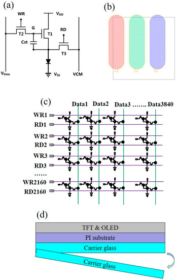 Figure 7b illustrates the sub-pixel arrangement in each pixel of the top-emitting flexible AMOLED display. Each pixel is composed of three sub-pixels (Red/Green/Blue). The areas of OLED are 4664 μm2 for R sub-pixel, 5088 μm2 for G sub-pixel and 5862 μm2 for B sub-pixel, respectively. Meanwhile, the pixel size is 29,756.25 μm2. Therefore, the average aperture ratio (the proportion of OLED area in the pixel) is 52.5%. Figure 7c shows the pixel expanding horizontally and vertically in two dimensions. The scan signals (WR1~WR2160, RD1~RD2160) are generated by the gate driver circuits. The data lines are connected to the external source IC.