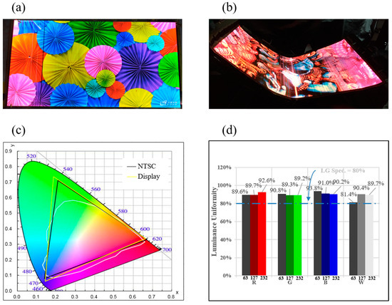 Our team has performed lighting tests on the fabricated OLED device, and as shown in Figure 8a, all pixels (2160 × 3840) light up successfully, demonstrating the functionality of the OLED devices. Additionally, even after the laser lift-off process, the display still works well, as shown in Figure 8b. In our previous study [3], the flexible display was continuously operated for 500 h. Colorimetric measurements were taken using the CIE at (0.72, 0.28), completely covering the BT.2020 color gamut (the black line in Figure 8c). The luminance uniformity of the flexible display was systematically studied using the following equation: