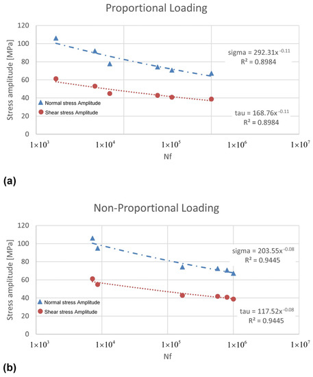 The results presented in Table 1 and Table 2 are shown graphically in Figure 3. This plot relates the normal and shear amplitudes as a function of the number of cycles and shows two SN curves per load. This way of plotting the stress amplitudes as a function of the number of cycles is not the conventional one. In the most common representation, the two amplitudes are converted into an equivalent parameter and then correlated with the number of load cycles Nf, resulting in a typical SN curve.