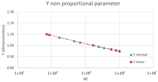The analysis of Expressions (10) and (11) shows that the difference between the normal Y parameter and the shear Y parameter is indeed negligible for the magnesium alloy AZ31BF. However, it is shown that there are experimental results for other materials where this difference is more pronounced [38]. Based on the plot of these expressions (Figure 4), where the evolution of the non-proportional sensitivity parameter Y is represented, it can be seen that the Y parameter does not remain constant over the number of cycles. Considering that a lower number of loading cycles leads to higher stress amplitudes and a higher number of cycles leads to lower stress amplitudes, it can also be concluded that the parameter Y varies as a function of the intensity of the stress amplitudes (normal and shear).