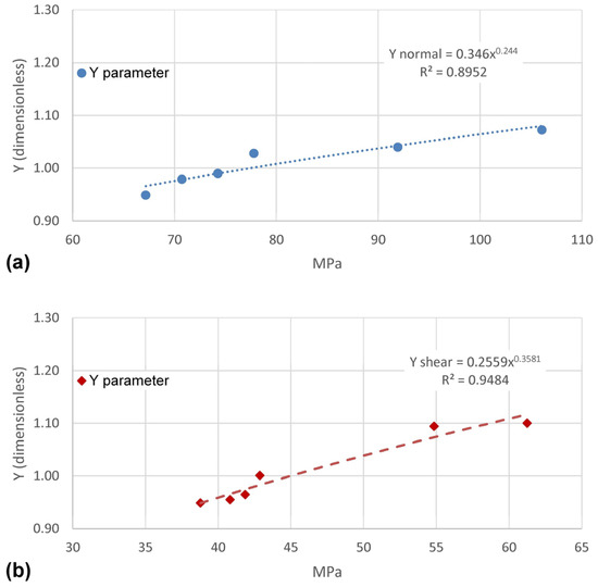 Figure 5 shows the plot of parameter Y as a function of the amplitudes of the normal and shear stresses. Based on these diagrams, the expressions for the parameter Y as a function of the amplitudes were determined, see Equations (12) and (13).
