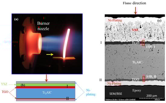 The burner and sample are shown in Figure 2. The YSZ coating was exposed face-on (arrow) to the hot gas exhaust of the burner. The 1300 °C test control coating surface temperature was targeted at the centerline of the hot zone. The schematic (Figure 2b) illustrates the arrangement of the Ni-plating, YSZ TBC top coat, Al2O3 scale (TGO), and Ti2AlC substrate in the polished cross-section with respect to hot gas impingement (arrow). Finally, a montage of the full cross-section (SEM/BSE, Figure 2c) shows actual microstructural features. The positions of the ~20 μm long FIB sections were across the TGO at both front and back faces, incorporating interfaces with the TBC and Ti2AlC matrix. These site-specific sections (TEM foils) at the coated front and uncoated backside were fibbed out using a ZEISS Auriga dual focused ion beam (FIB)/SEM microscope, and are marked as “FIB, I” and “FIB, II”, resp. in Figure 2. The TEM foils were then examined in a Thermo-Fisher Talos F200S scanning/transmission electron microscope (S/TEM) for detailed microstructural, phase, and chemical analyses.