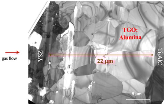 Thermal barrier coatings (TBC) are widely used and studied for turbine airfoil applications [1]; these generally employed Ni-base superalloys with a maximum use temperature of 1150 °C. This limitation is dictated by the creep properties of the metal and the spallation tendency of the TBC and thermally grown oxide (TGO) scale. The latter is primarily α-Al2O3 formed on oxidation-resistant Ni(Pt)Al or Ni(Co)CrAlY bond coats. It is driven toward failure by a coefficient of thermal expansion mismatch with the substrate alloys. Since higher temperatures produce greater operational efficiencies, studies are often directed toward systems allowing greater use of temperature. One example is using novel substrates with exceptional oxidation resistance [2]. In this regard, more recent substrates that exhibit excellent oxidation resistance are the Al2O3—forming Ti2AlC and Cr2AlC MAX phases. Furthermore, these substrates have close thermal expansion matches with α-Al2O3 and YSZ, and provide motivation to explore TBC durability [3,4]. These initial demonstrations, provided by furnace tests, indeed showed that TBC/MAX phase systems could survive orders of magnitude longer than conventional superalloy systems. Consequently, follow-on works employed even more demanding burner rig tests [5,6].