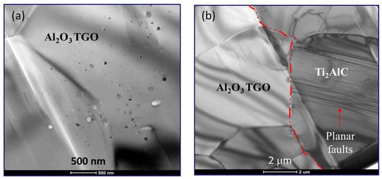 Features in Al2O3 TGO (I): (a) Fine 50 nm, dispersed intragranular porosity (light) and particles (dark) in Al2O3 grains near TBC; (b) clean, intact Al2O3/Ti2AlC interface (dashed red line) and ~20 closely spaced, highly aligned linear faults in the Ti2AlC grain.