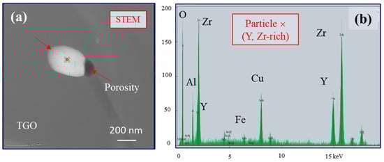 The first image (Figure 3) shows the ~22 μm thickness of the Al2O3 scale (TGO) at the front burner side: also present in this foil was a small amount of the adjoining YSZ of the thermal barrier coating on the left and the Ti2AlC MAX phase substrate on the right. The alumina grains (columnar) are on the order of 5 μm wide at the Ti2AlC interface and slightly smaller (equiaxed), ~3 μm, at the YSZ interface. More detail is presented in Figure 4. The Al2O3 -Ti2AlC interface was very clean and intact (Figure 4b). An array of long planar faults was apparent in a Ti2AlC grain, reflective of the basal faulting that may occur in MAX phases to accommodate stoichiometric variations, discussed later. The image in Figure 4a is from the central portion of the Al2O3 scale. It shows a small amount of intragranular porosity, generally finer than the intergranular pores displayed at lower magnification. Many of the pores were seen to be associated with dark nanoparticles, all quite fine, in the order of 100 nm. Similar pore-metal features were observed previously for alloy oxidation and may be typical of alumina scales. The white particle in the STEM image (Figure 5) showed high Y, Zr content (Figure 5b), with a small Fe peak and Cu from the support grid. The Y, Zr implies some diffusion from the TBC to the internal region of the scale. By comparison, EDS analysis of the featureless scale revealed only Al, O peaks (not shown). In addition, occasional light grey grains in the TBC match contrast with those at the Al2O3 scale interface and are believed to be Fe-rich oxide, as indicated by the EDS. The TGO/YSZ interface is shown in Figure 6a–d, with YSZ, Al2O3, and a few Fe-rich grains at the interface. These were likely iron-oxide grains formed due to spurious Fe-contamination during coating processing.