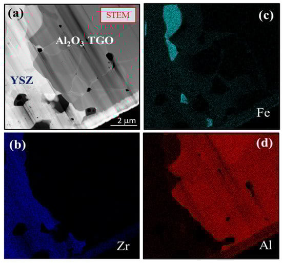 STEM image (a) of the TBC/TGO interface (I): elemental rasters (b–d) show Fe-rich particles at interface (500 h at 1300 °C).