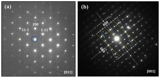 SADP’s of (a) clear (C) [011], (beam marked by O) and (b) faulted (F) [001] YSZ grains (from Figure 7a,b), the latter showing many extra reflections probably related to variants of t″ domain orientation. In (b), the parent phase is shown as an orthogonal grid of {200} reflections. Extra reflections appear to arise from two twin variants, marked by the yellow and aqua dashed grids, slightly off-zone. The trace of possible twin habit planes, shown as orthogonal [200] and [020] axes (a0 for YSZ is 5.1 Ả for the cubic parent phase and indistinguishable from tetragonal).