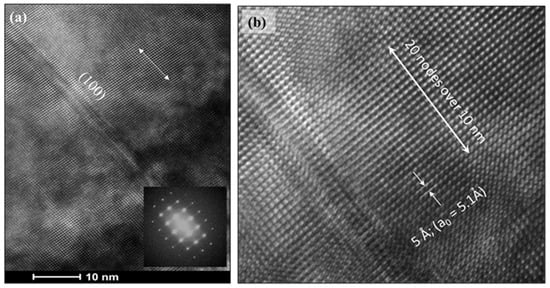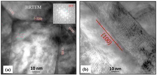 The images in Figure 7 show the YSZ TBC region, which was generally a mosaic of 1–2 μm “clear” (C) and adjacent smaller, heavily faulted grains (F). The “feathery” nature of the YSZ columns appears to have sintered away. Large 1–2 μm intergranular pores and finer 0.1–0.2 μm pores were prevalent. The faulted grains are also replete with a high density of strain contours, consistent with transformation stresses. Figure 8a presents the SADP of a clean grain (C) and yields a clean cubic pattern for the ZrO2 fluorite [110] zone axis. Since no (112) reflections are present in this zone axis, no information is obtained regarding the ordered tetragonal phases. A faulted grain (F), also produced a “cubic” [100] zone axis SADP with {100} and {110} reflections present (Figure 8b). This zone axis also showed a multitude of additional reflections. The latter were probably related to two twinned variants of a tetragonal daughter phase with respect to the cubic parent phase. Figure 9 presents an assemblage of lathes, believed to be ferro-elastic tetragonal domains. Such arrays can minimize strain energy under stress [9,10]. The <100>, <110> fault planes were seen as domain boundaries, with the FFT zone axis as [100] for the central grain. Another HRTEM image, Figure 9b, revealed multiple parallel lathes of the YSZ phase, ~20 nm wide. While the center lath appeared featureless, the two bordering it exhibited similar cross-hatch patterns, in colonies, with some resemblance to Moire’s fringes. It is speculated that similar overlapping tetragonal colonies make up these structures. Tetragonal YSZ has nearly identical a, c unit cell dimensions, but varying orientations due to oxygen ion shifts along the z-axis [11]. HRTEM images were obtained near that region and produced a nearly orthogonal lattice structure and corresponding FFT diffraction pattern (Figure 10). The nodes along ⟨100⟩ (Figure 10b) show a spacing of ~0.5 nm (5 Ả), approximating the unit cell dimension of 5.1 Å.