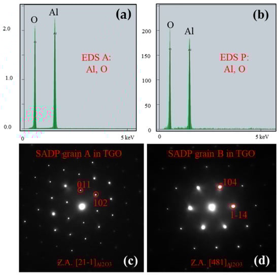 Figure 11 presents the uncoated backside of the Ti2AlC sample. The Al2O3 TGO grew to ~14 μm; this was less than the front face because of the lower backside temperature of ~1216 °C. The Al2O3 grains were again columnar and presented a very clean, faceted interface with Ti2AlC. The EDS of a grain interior (Figure 12a) showed only Al and O, as well as for a particle (P) in the MAX phase. (Similar clean Al, O EDS spectra were obtained for the front side, I, featureless TGO regions). The SADP’s of the TGO (Figure 12c,d for grains marked A and B) were consistent with trigonal (pseudo-hexagonal) corundum, a = 4.8 Ả, c = 12.9 Ả, near Z.A. [21–1] and [481], respectively. Figure 13a shows very fine nm-size TGO particles in the vicinity of the triple point in Figure 11, yielded EDS showing Ti (Figure 13b), while that (F) associated with a pore contained Fe (Figure 13c).
