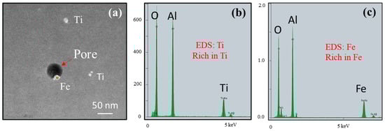 (a) Al2O3 TGO triple point region marked O in Figure 11, showing fine ~25 nm Ti- and Fe-rich particles. EDS spectra of Ti (b) and Fe (c) particles.