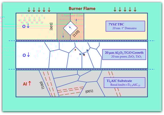 Schematic of substructural features revealed by FIB/STEM for a novel YSZ/Ti2AlC system after aggressive oxidation in a burner test, flame direction, arrows (not to scale). Ferro-elastic t″ tetragonal domains in the TBC; adherent, inward growing, columnar α-Al2O3 grains, with only minor nm pores or particle defects, red/blue spots; and the Ti2AlC MAX phase substrate, with Al-poor stacking faults, red dashes, but no Al depletion zone.