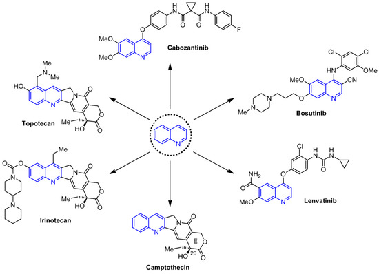 Quinoline consists of a pyridine fused with a benzene ring at two adjacent carbon atoms. It is a weak tertiary base (pKb of 4.85) that shows both electrophilic and nucleophilic substitution reactions with analogs to benzene and pyridine [1]. Synthetic and naturally occurring quinolines have been used as potent pharmacophores due to their wide range of biological activities, such as anti-malarial [2], antibacterial [3], antiviral [4], antifungal [5], antipsychotic [6], anti-inflammatory [7], analgesic [7], anti-asthmatic [8], anti-leishmanial [9], and anti-hypertensive activities [10]. Modern medicinal chemistry is significantly impacted by quinoline analogues, which have resulted in several anticancer drugs that are either commercially available on the market or in different stages of clinical trials involving different mechanisms of action [11,12,13,14,15,16]. A significant number of protein kinase inhibitors are based on quinoline (Figure 1), including cabozantinib (Cabometyx®) used for the treatment of advanced renal cell carcinoma (RCC) and medullary thyroid carcinoma (MTC), which acts as a multi-targeted tyrosine kinase inhibitor, including vascular endothelial growth factor receptor 2 (VEGFR2), hepatocyte growth factor receptor (c-MET/HGFR), and proto-oncogene tyrosine-protein kinase receptor (RET) [12,17], bosutinib is employed to treat the chronic myelogenous leukemia (CML), which act as a strong inhibitor of Bcr-Abl kinase [12,18], and lenvatinib is used to treat the thyroid cancer and in combination with other medicines to treat advanced renal cell carcinoma (RCC) and hepatocellular carcinoma (HCC), acting as a multi-targeted kinase inhibitor against vascular endothelial growth factor receptors (VEGFR 1–3), fibroblast growth factor receptors (FGFR 1–4), and platelet-derived growth factor receptors (PDGF-R) [12,19]. There are relevant quinoline-based topoisomerase inhibitors, including camptothecin (CPT), that act as inhibitors of DNA topoisomerase I; however, it has a poor pharmacokinetic profile, including low stability and solubility (Figure 1) [11]. The α-hydroxy lactone ring (E-ring) constitutes the most critical component of its structure, which engages with the topoisomerase enzyme through one hydrogen bond of the hydroxy group in position 20 with Asp533, alongside two hydrogen bonds of the lactone with amino groups on Arg364 [11]. To address the limitations of camptothecin, numerous semisynthetic derivatives of CPT have been effectively synthesized so far. Figure 1 illustrates that irinotecan is effective in treating Colorectal cancer, whereas topotecan is used to treat Small-cell lung, Cervical, and Ovarian cancers [20].