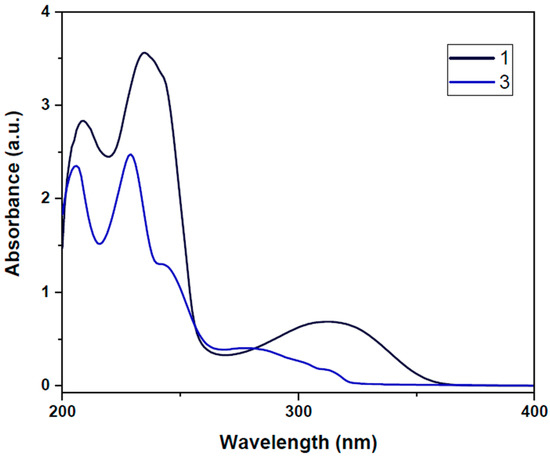 The study of 8-hydroxyquinoline derivatives remains an intriguing subject due to their innumerable applications in photoluminescence [55], electroluminescence [56], organic photovoltaic devices [57], and selective detection of various metal ions due to their high chelating ability [28,29,30,31]. For that reason, we conducted UV–Vis studies for 8-hydroxyquinoline (1) and quinolin-8-yl 4-chlorobenzoate (3) in the range of 200–400 nm in methanol solution (50 μM). As illustrated in Figure 3, compound 3 exhibited four distinct bands across the range of 200–300 nm with differing levels of intensity. Absorption bands at 205/229 nm (ε = 47,000/49,600 L·mol−1·cm−1) and 243 nm (ε = 26,400 L·mol−1·cm−1) are attributed to π → π* transitions of quinoline and 4-chlorobenzoate chromophores, respectively [32,54]. Additionally, the quinoline-containing ester is associated with an absorption band at 278 nm (ε = 8400 L·mol−1·cm−1), which is attributed to the n → π* transition. As shown in Table 4, the incorporation of the 4-chlorobenzoyl group into 8-hydroxyquinoline (1) caused a hypsochromic effect in π → π* transitions from 208 to 205 nm and 235 to 229 nm, as well as in the n → π* transition from 312 to 278 nm. In addition, we observed a strong hypochromic effect in π → π* and n → π* transitions.