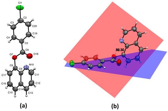 CSD database version 5.41 (date of the search: March 2023) using ConQuest software version 2020.1 did not show results for molecules with the exact structural formula. However, a molecular analog named 2-aminoquinolin-8-yl 4-chlorobenzoate was found [58]. Figure 5a shows the molecular structure of 3. The dihedral angle between the planar fragments that contain the aromatic moieties has a value of 89.30°, suggesting an orthogonal conformation (Figure 5b). It is interesting that the presence of one amine group substituting the quinoline ring in the analog 2-aminoquinolin-8-yl 4-chlorobenzoate distorts this orthogonality, changing the dihedral angle to 72.58 and 79.21° due to the presence of N-H···N hydrogen bonds [58].