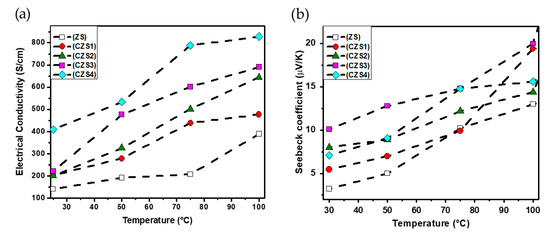 Figure 1a,b display, for all the samples, the values of the electrical conductivity and of the Seebeck coefficient as a function of temperature.