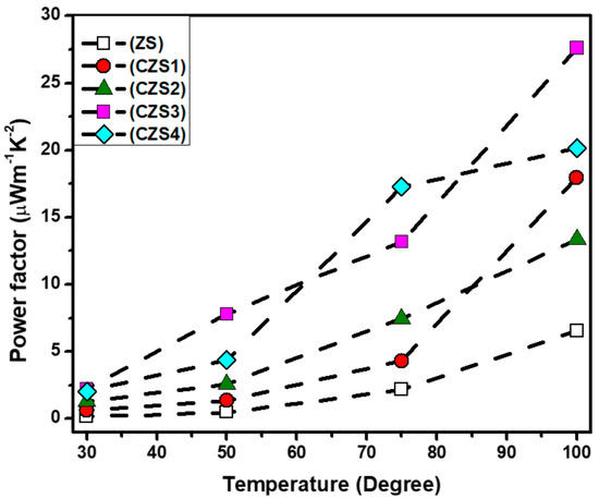 The power factor of Zn1−xCuxSe was calculated according to the formula PF = S2σ, where S is the Seebeck coefficient and σ is the electrical conductivity. The graph of the power factor versus temperature, for all the samples, is shown in Figure 2.