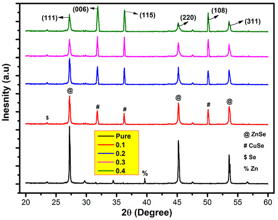 The X-ray diffraction pattern of Cu-doped ZnSe nanoparticles, scanned at 2θ in the range of 20–60°, is shown in Figure 4.