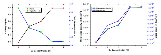 Figure 5 reports, as a function of the dopant concentration, the calculated values of the full width at half maximum, of the crystalline size, of the dislocation density and of the microstrain, extracted from the (111) peak of Zn1−xCuxSe.