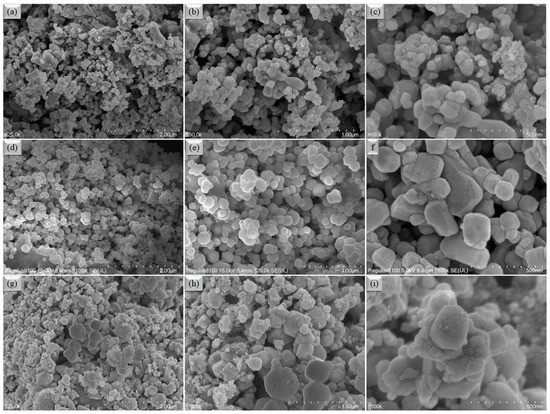 (a–c) SEM image of LSCF; (d–f) SEM image of the prepared GDC; and (g–i) SEM image of the LSCF-GDC heterostructure composite image, respectively.