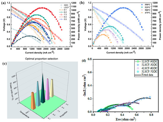 Typical I-V and I-P characteristic curves utilizing (a) pure LSCF, GDC, 1LSCF-9GDC, 8LSCF-2GDC, 3LSCF-7GDC, 4LSCF-6GDC, and 5LSCF-5GDC operating at 550 °C (b) I-V and I-P characteristic curves of using 3LSCF-7GDC as an electrolyte in fuel cells operated at different operating temperatures of 475–550 °C; (c) shows the comparison of the fuel cell performance using our prepared different heterostructure composites of LSCF-GDC as an electrolyte under 550 °C and (d) electrochemical impedance spectra of the fuel cells using different heterostructure composites of LSCF-GDC as an electrolyte at 550 °C measured in H2/air.